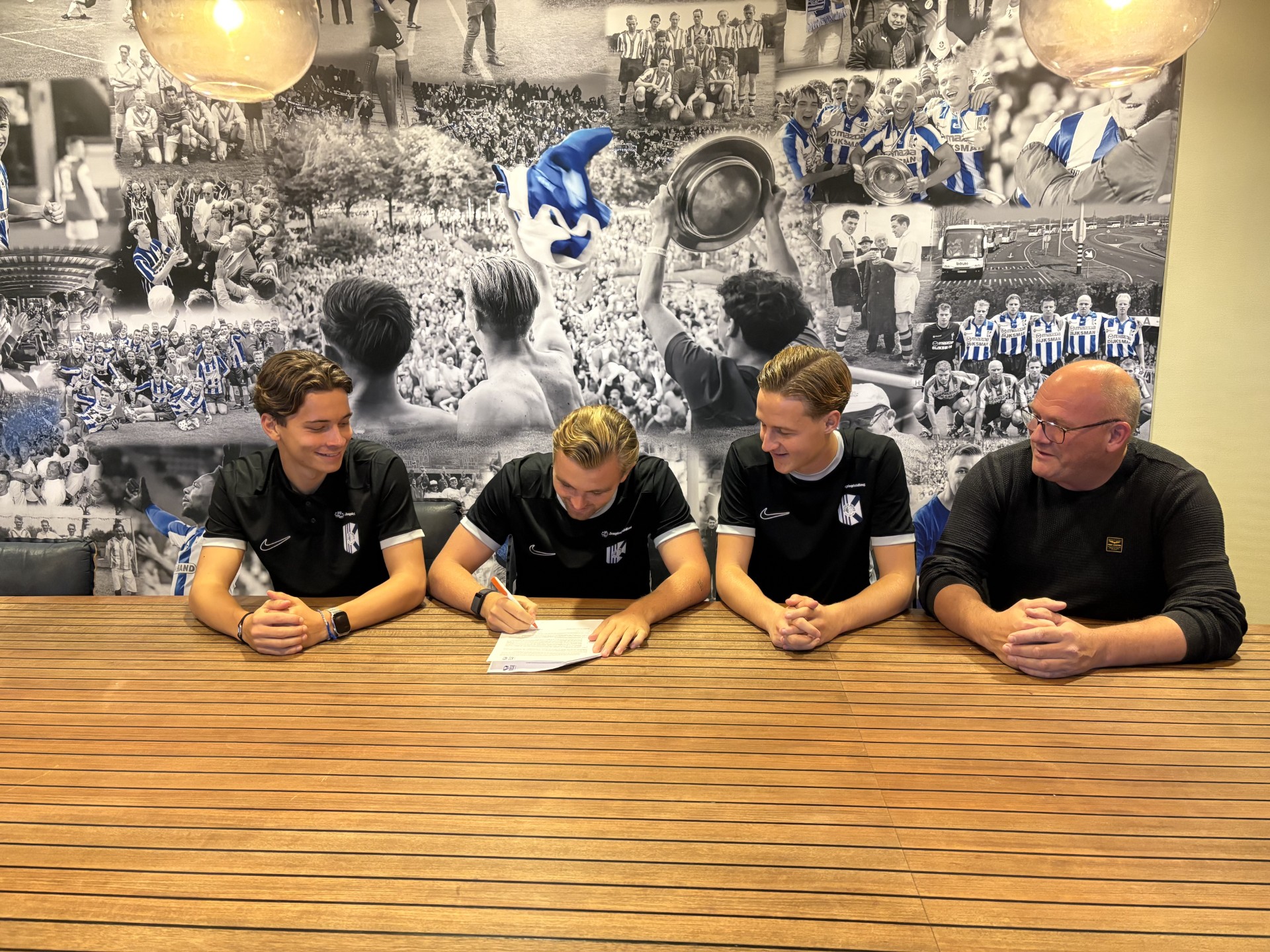 Joël Smit, Kjeld Schuitemaker en Matthijs van der Plas namens ACA, samen met bestuurslid Bert Kloos tijdens de ondertekening van de samenwerkingsovereenkomst.