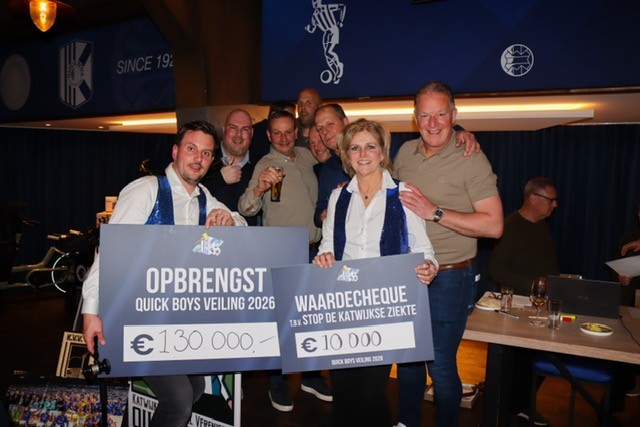 De veiling leverde een prachtig resultaat op. €10.000 gaat naar onderzoek naar de Katwijkse Ziekte, een doel waar we als Katwijkse club nauw bij betrokken zijn. Daarnaast komt €130.000 ten goede aan de vereniging, onder meer voor investeringen in Quick Boys 1, veiligheid op het sportpark, duurzaamheid en de verdere ontwikkeling van de jeugd.