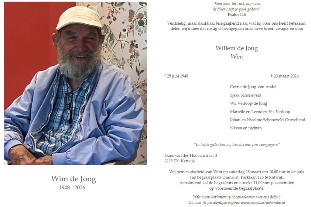 Wij ontvingen het verdrietige bericht dat Wim de Jong op 23 maart 2026 is overleden, op 77-jarige leeftijd.